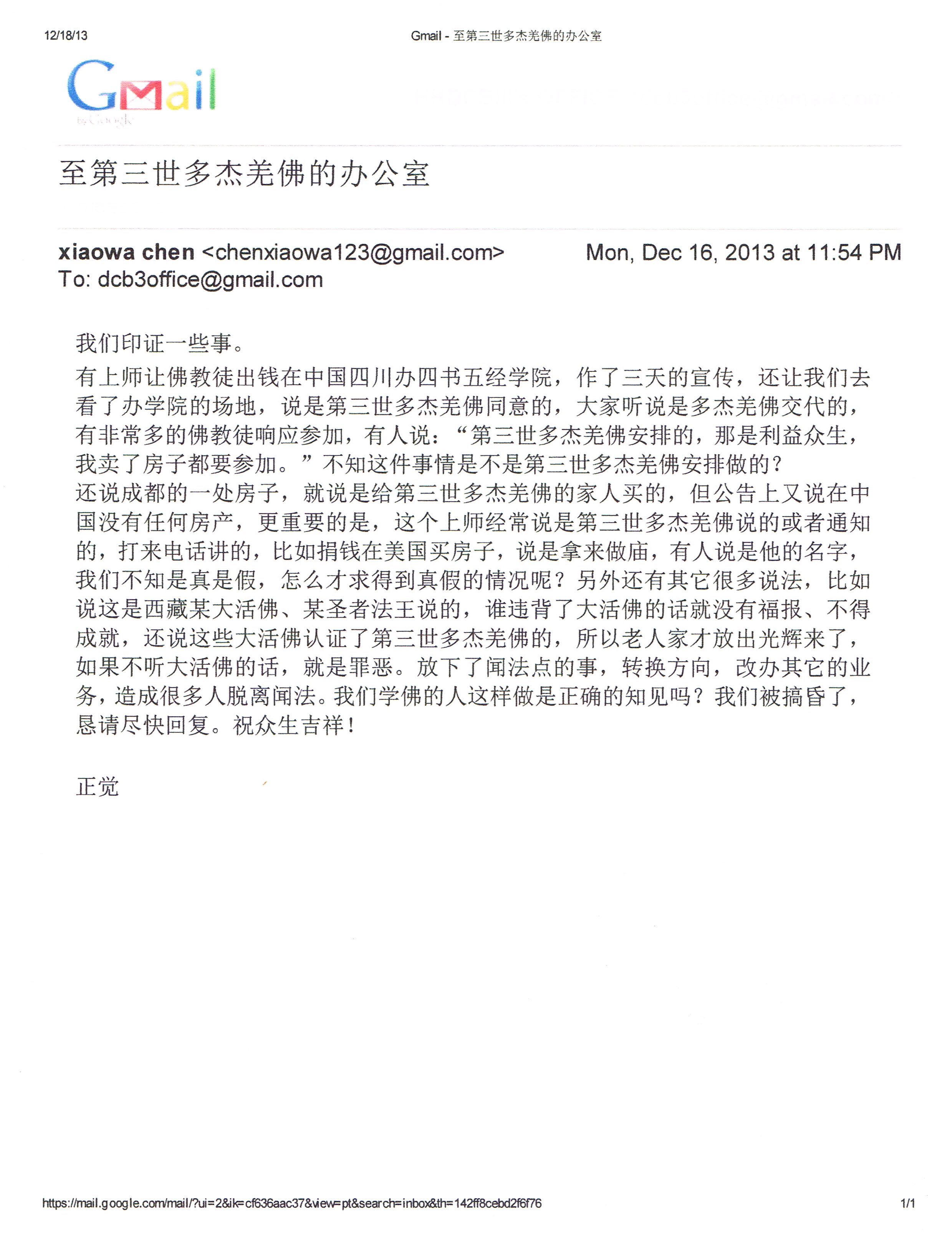 辦公室深深知道,上述這些問題本是無聊的是非,但是,來函要求印證的事情是很嚴肅、原則而重大的,因此特予印證回覆。其實,最根本的問題就是,無論是上師級的行人,還是普通的行人,都要認認真真地遵照H.H.第三世多杰羌佛的教導,恭聞H.H.第三世多杰羌佛的法音,切切實實地修行,利益衆生,互相關心,以128條知見去衡量、鑒别上師、弟子和一切佛教徒的行為,自己就會得出正與邪的結論。