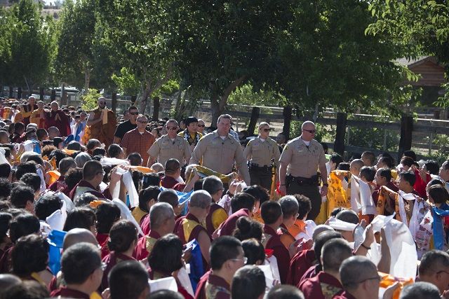 H.H.第三世多杰羌佛出席了世界佛教总部举行的法会会场,祂在警察多重护卫着,从红地毯走入池畔,与会七众,夹道手持哈达跪迎,高呼南无第三世多杰羌佛佛号。法会期间,艳阳高照,虽然温度居高不下,在华氏82度左右,竟然殊胜到了会场内外,不但不觉得热,还有凉爽的感觉。